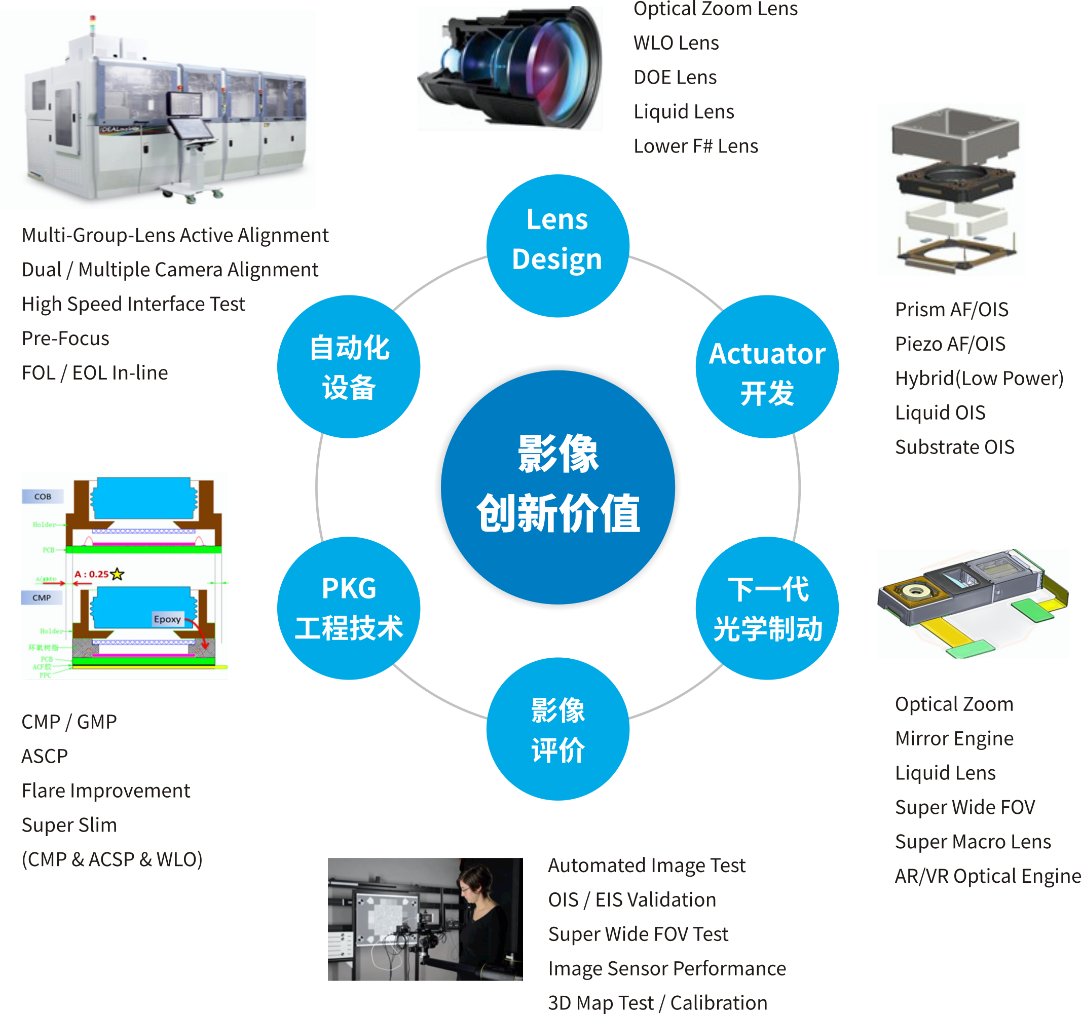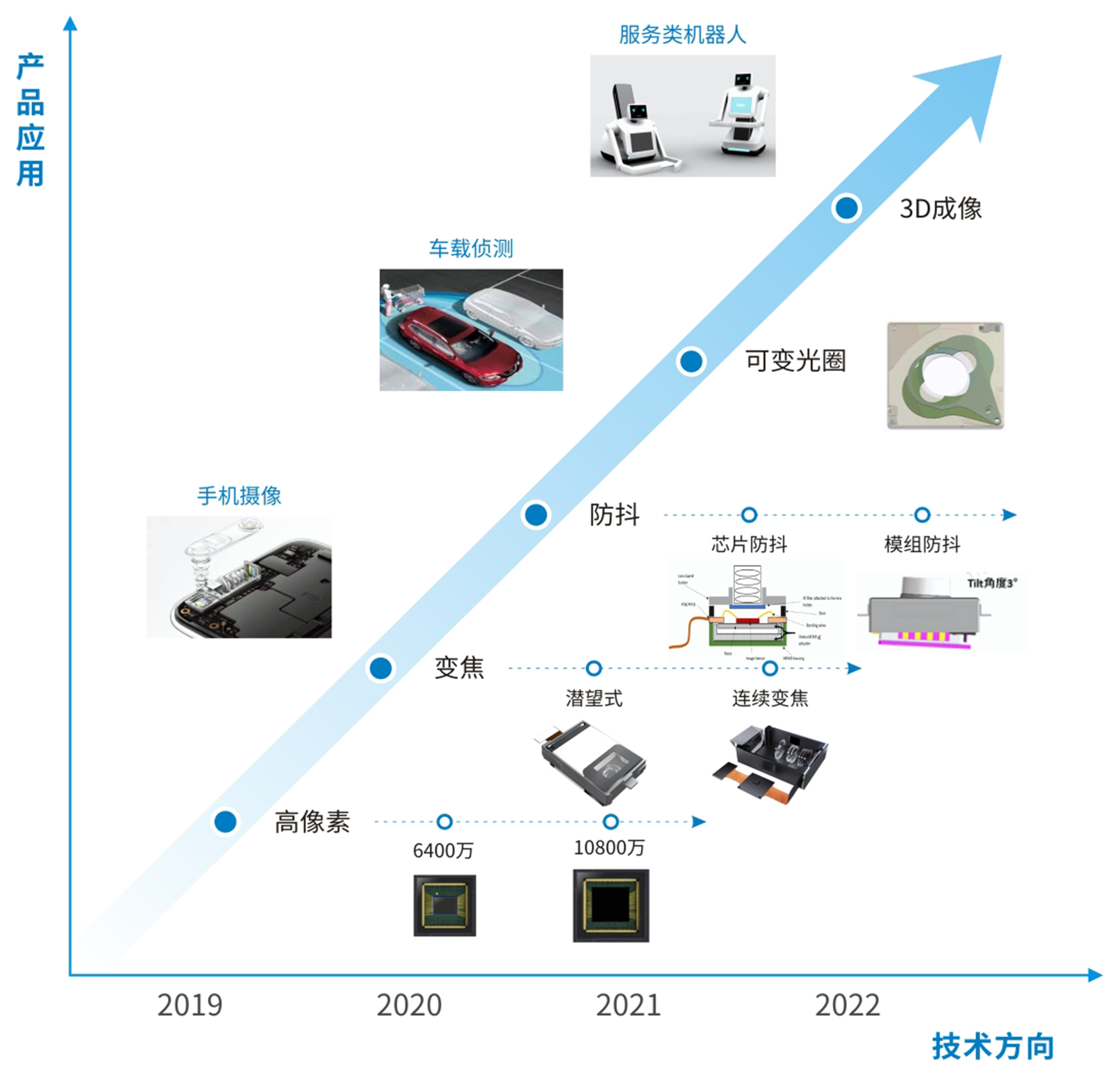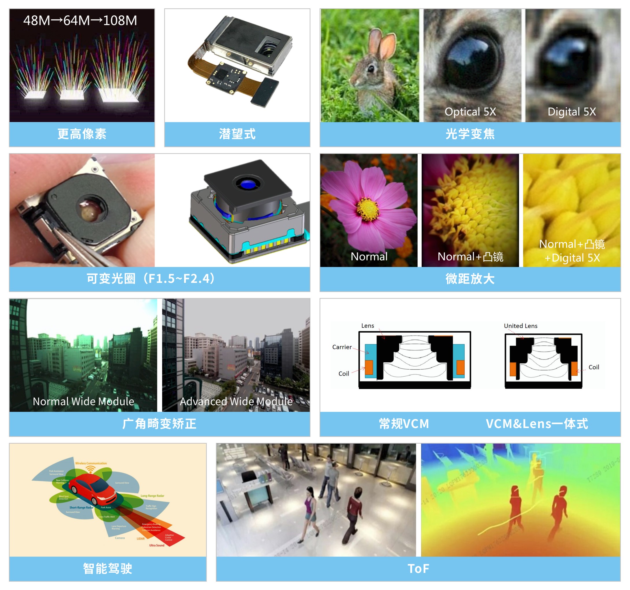 更高像素/潛望式/光學(xué)變焦/可變光圈(F1.5~F2.4)/微距放大/廣角畸變矯正/常規VCM、VCM&Lens一體式/智能駕駛/ToF