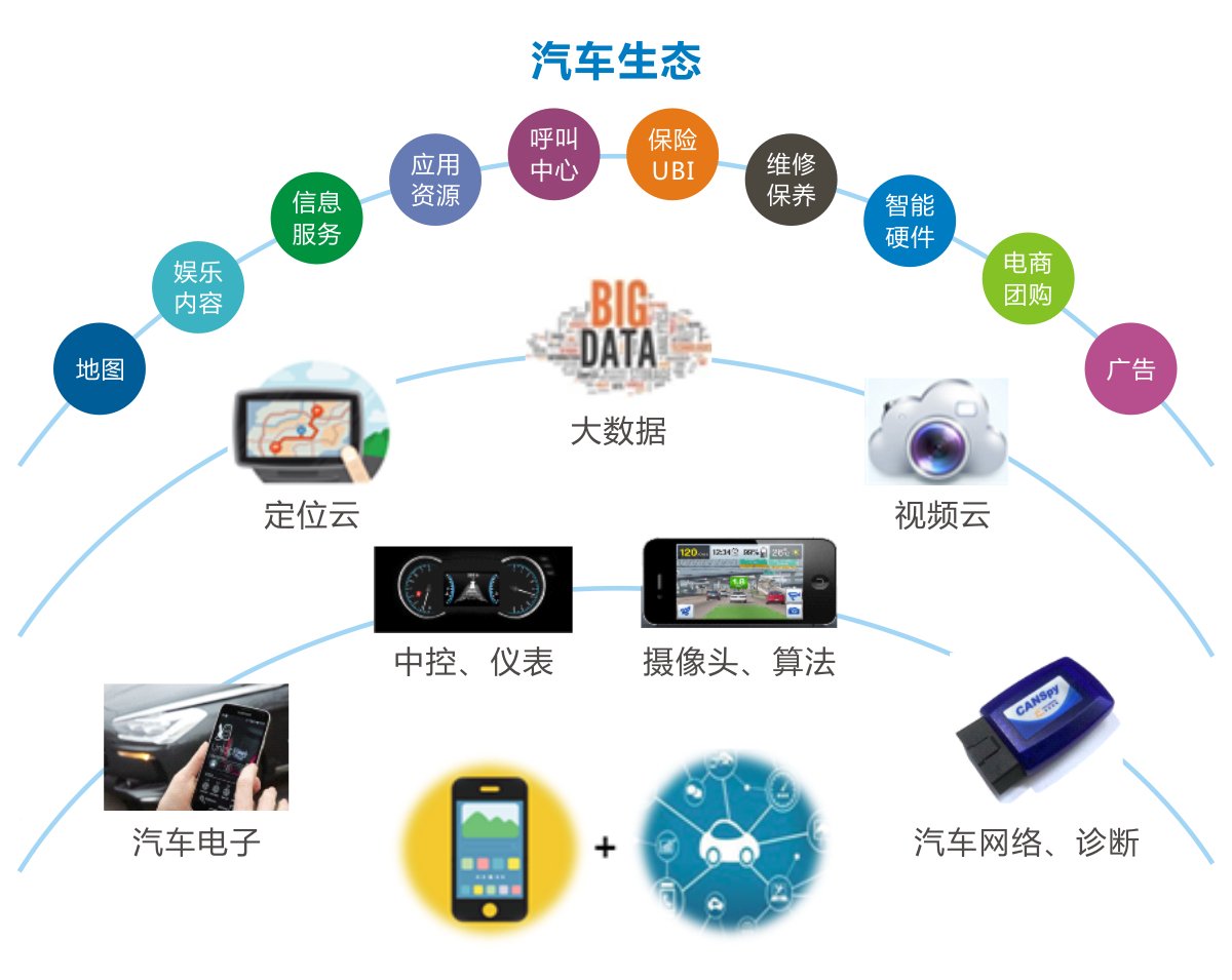 在汽車(chē)互聯(lián)網(wǎng)+領(lǐng)域,以手機和車(chē)的結合為主軸,依托總線(xiàn)技術(shù)、無(wú)線(xiàn)互聯(lián)技術(shù),依托自身在汽車(chē)各領(lǐng)域的產(chǎn)品切入汽車(chē)內部,構建汽車(chē)與云端平臺的管道,建立汽車(chē)生態(tài)及大數據平臺,提升附加值,為用戶(hù)提供最佳的行車(chē)體驗。