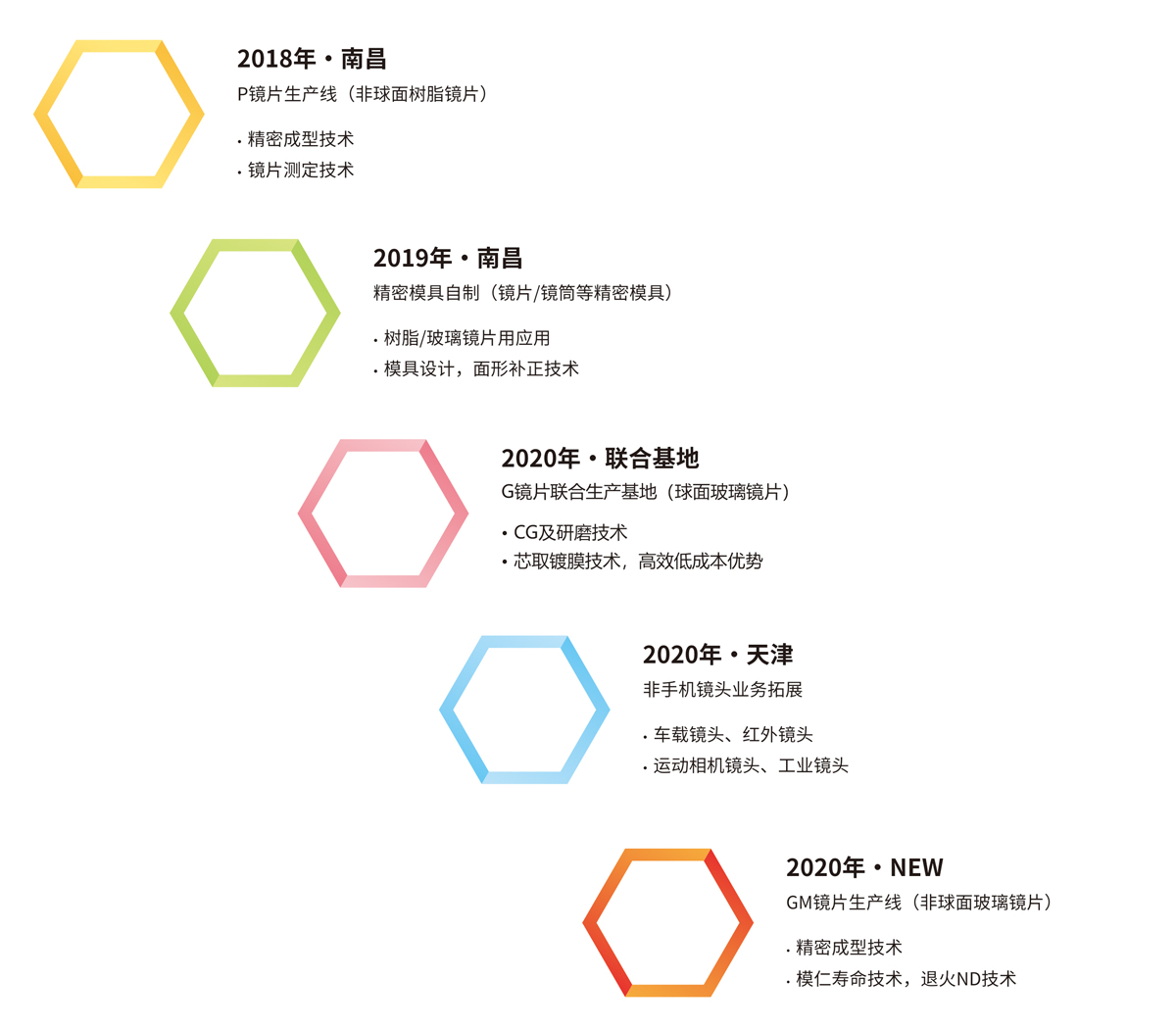 未來(lái)公司將集中優(yōu)勢資源持續加強高端鏡頭、玻塑混合、超薄鏡頭、廣角鏡頭、潛望鏡頭及新型技術(shù)領(lǐng)域產(chǎn)品的開(kāi)發(fā),多方位布局車(chē)載鏡頭、紅外鏡頭、運動(dòng)相機鏡頭及VR/AR鏡頭,也會(huì )在HUD,智能大燈,激光雷達上投入研發(fā)與生產(chǎn)力量。